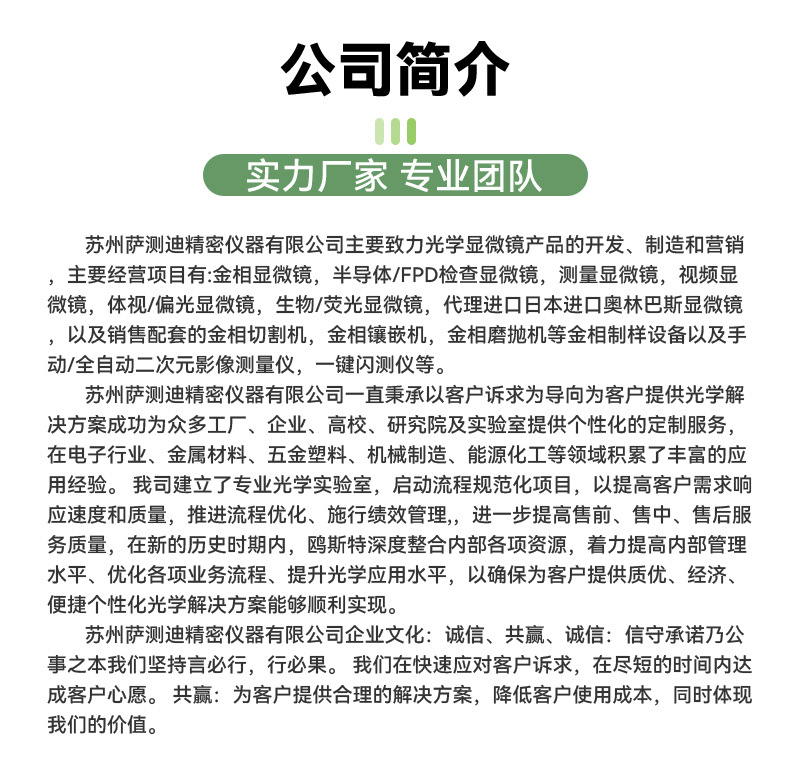 苏州萨测迪精密仪器有限公司主要致力光学产品的开发、制造和营销,主要从事的经营项目:金相显微镜,视频显微镜,测量显微镜,半导体检查显微镜,体视显微镜,生物显微镜以及代理进口奥林巴斯/尼康显微镜等,公司自2011年成立以来,一直致力于光学显微镜以及光学测量产品的开发,公司配套完整的光学实验室以及完善的售前售后专业团队,力求为客户提供完整的光学解决方案。
